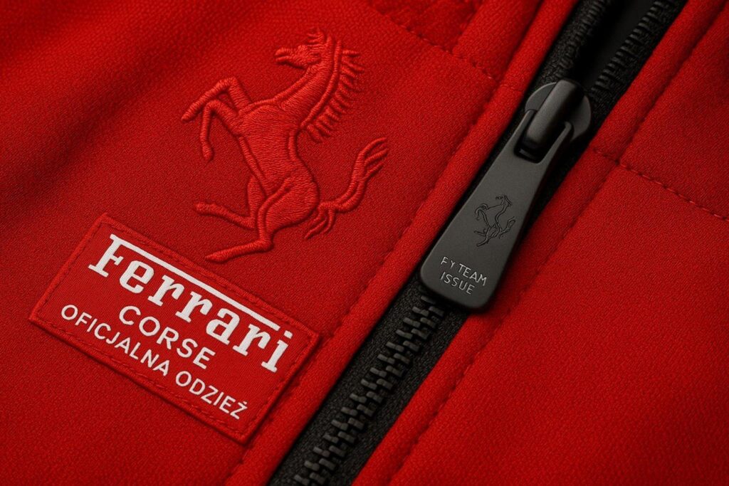 Najważniejszym elementem każdego stroju jest Cavallino Rampante – czarny wierzgający koń na żółtej tarczy. To jeden z najbardziej znanych znaków na świecie, którego historia sięga czasów I wojny światowej i asa lotnictwa Francesco Barakki. Logo symbolizuje prędkość, zwycięstwo i wytrwałość. Uzupełnia je barwa Rosso Corsa, czyli wyścigowa czerwień, utożsamiana z włoskim temperamentem i energią.