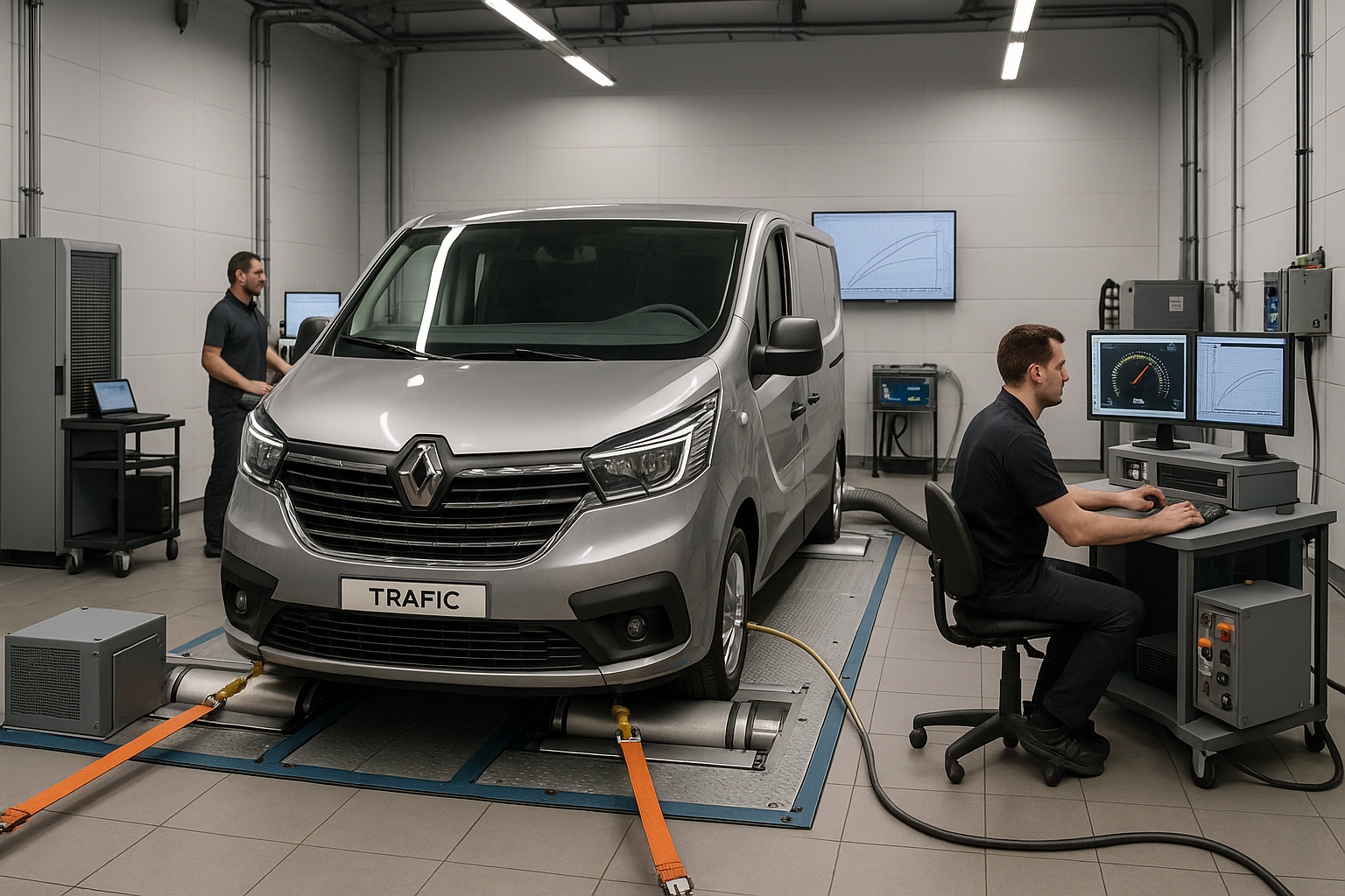Renault Trafic to jeden z najpopularniejszych busów w Europie, więc jego rzetelna diagnostyka jest na wagę złota. Najnowsza generacja (roczniki 2021-2024) korzysta z nowoczesnej, 40-pinowej instalacji elektrycznej. W praktyce oznacza to więcej modułów i czujników niż we wcześniejszej, 24-pinowej wersji (2015-2021). Dzięki temu auto potrafi „wiedzieć o sobie” naprawdę sporo – ale równocześnie sprawia, że testowanie staje się bardziej wymagające. Testy na hamowni będą idealnym rozwiązaniem przed wypuszczeniem samochodu na drogi. Niezbędny w takich przypadkach będzie blokada licznika kilometrów, który sprawi, że pojazd wskaże rzeczywisty przebieg na drogach, a nie kilometry spędzone na hamowni i testach.