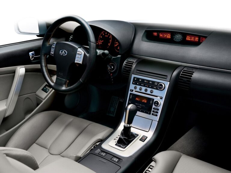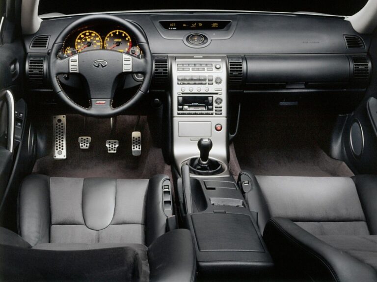 Wnętrze samochodu powstało z myślą o luksusowym, ale i sportowym stylu. Z przodu pasażerowie byli otoczeni wygodnymi, wysoko podpierającymi fotele. Skórzana tapicerka była standardem. Infiniti zainstalowało wysuwany wyświetlacz na centralnym panelu dla systemu nawigacji, którym sterowano za pomocą małego panelu. Nawet jeśli nie był to najbardziej praktyczny system na rynku, był jednym z najlepszych według standardów z 2002 roku. Pod tym panelem umieszczono sterowanie klimatyzacją oraz znakomity system dźwiękowy Bose z odtwarzaczem CD i kasetowym. W zależności od wersji, w konsoli centralnej znajdował się dźwignia biegów lub selektor biegów. Przed kierowcą znajdowała się kierownica z kilkoma przyciskami do obsługi systemu audio i tempomatu. Po dostosowaniu jej do kąta, poruszała się wraz z zegarami instrumentów. Pomarańczowe tarcze i wskaźniki były typowe dla Nissana z początku lat 2000. Z tyłu, kanapa składana w jednym kawałku oferowała miejsce dla dwóch osób. Niestety, przestrzeń na głowę była znacznie ograniczona.