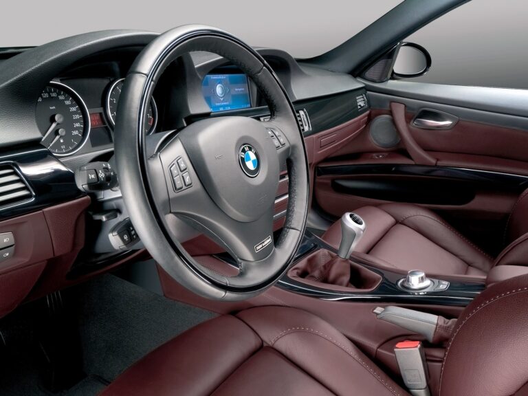 Wnętrze samochodu było wykończone materiałami o wyższej jakości niż w E46, z fotelami sportowymi lub wzmocnionymi, w zależności od wersji i opcji. Istniały dwie wersje deski rozdzielczej – jedna bez jednostki iDrive, a druga zintegrowana. Ta pierwsza miała smukłą linię, podczas gdy druga charakteryzowała się podwójnym „garbem”, gdzie górna część na centralnym panelu mieściła kolorowy wyświetlacz systemu multimedialnego. Przed kierowcą znajdował się zaokrąglony zestaw wskaźników z klasycznym układem dla producenta, z dużymi wskaźnikami prędkościomierza i obrotomierza flankowanymi mniejszymi wskaźnikami poziomu paliwa i temperatury płynu chłodzącego. Dodatkowo pod nimi znajdował się wyświetlacz LCD, pokazujący dane z pokładowego komputera oraz licznik kilometrów. Pomiędzy przednimi pasażerami znajdowała się konsola środkowa, która mieściła dźwignię zmiany biegów lub selektor biegów w wersjach automatycznych, podłokietnik z miejscem do przechowywania oraz małe otwarte miejsce na drobiazgi. Nie było tam uchwytów na kubki, co niektórych klientów irytowało. Z tyłu wygodna kanapa mogła pomieścić trzech pasażerów, chociaż wysoki tunel skrzyni biegów znacznie ograniczał miejsce na nogi.