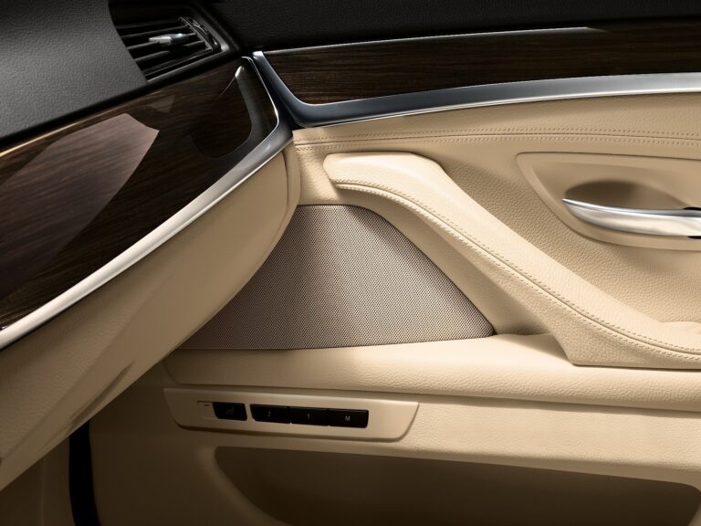 Wybór kolorów i materiałów dodatkowo podkreśla wrażenie osobistego luksusu oraz interakcję linii i powierzchni w wnętrzu. Dla górnej części deski rozdzielczej o finezyjnej fakturze dostępne są dwie wersje kolorystyczne w zależności od wybranego koloru wnętrza. Skórzana tapicerka Dakota jest standardem w modelu 550i, a dostępna w sześciu schematach kolorystycznych, z czego trzy są nowe; luksusowa skóra Nappa BMW jest opcjonalna i dostępna w trzech schematach kolorystycznych.