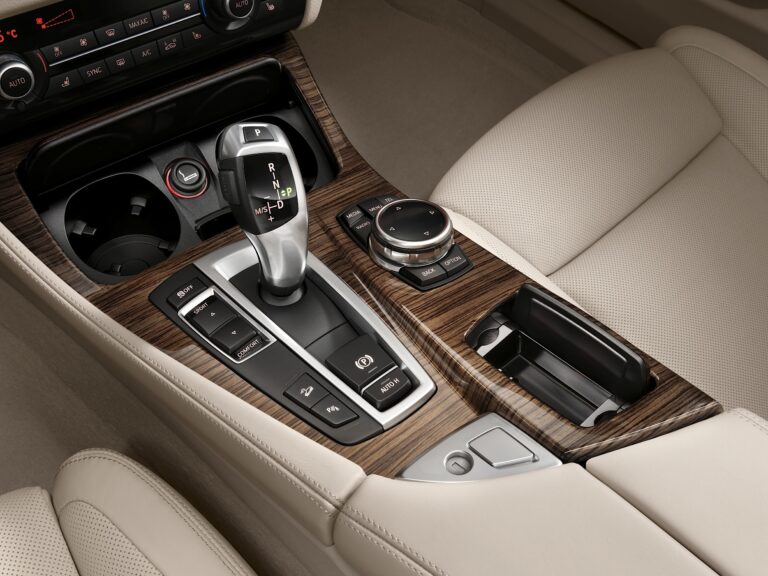 W modelach z automatyczną skrzynią biegów przestrzeń pomiędzy elektroniczną dźwignią zmiany biegów a jednostką sterującą klimatyzacją oferuje wystarczająco dużo miejsca na dwa uchwyty na kubki oraz uchwyt na klucze. Dodatkowa komora na drobiazgi znajduje się za kontrolerem iDrive (gdzie w modelach z manualną skrzynią biegów znajduje się kolejny uchwyt na kubki).