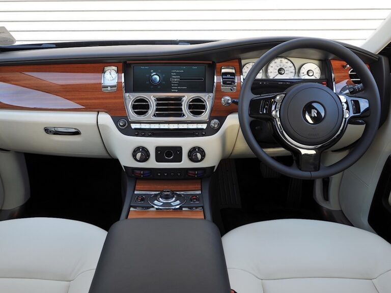 Rolls-Royce Ghost jest bardziej skoncentrowany na kierowcy niż jakikolwiek inny model Rolls-Royce wcześniej. Kierowca siedzi w nieco podwyższonej pozycji za kierownicą, co określane jest jako pozycja autorytatywna. To sprawia, że widok drogi jest znacznie klarowniejszy. Deska rozdzielcza została celowo oczyszczona; ma przestronny design i intuicyjny układ. Kontrolki są starannie wyrzeźbione, a ważniejsze funkcje są podkreślone akcentami chromu. Miękkie światło panelu instrumentów promieniuje przez znaną kierownicę z czarnym obręczą, która z kolei wykorzystuje szereg klawiszy wiolinowych oraz ergonomiczne sterowanie kulkowe.
