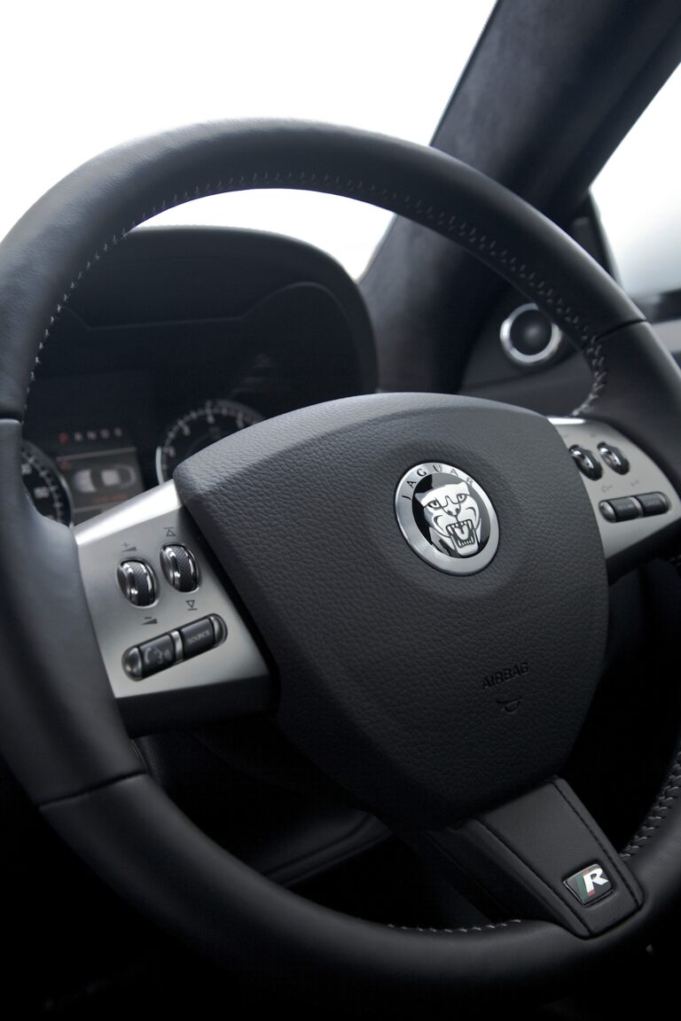 Powitanie w samochodzie jest również wzmacniane przez jasne wkładki progowe. Wiele innych zmian podkreśla wysoki poziom rzemiosła Jaguara z biżuteryjnymi akcentami. Trójramienna kierownica zawiera dolne ramie owinięte skórą oraz uderzający znaczek „growler” Jaguara. Wskaźniki Jaguara XKR jeszcze bardziej podkreślają sportowy charakter samochodu za pomocą czerwonych wskaźników i białego podświetlenia.
