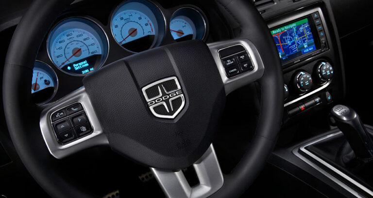 Przekazując nowe precyzyjne prowadzenie Challengera i odczucie drogi, nowy, gruby, trójramienny kierownica Dodge oferuje lepsze doznania i przyczepność. Odpowiednio dobrana, ręcznie szyta kierownica owinięta skórą ma srebrne metalowe malowane ramiona umiejscowione na godzinach 3, 6 i 9. Nowa sportowa kierownica posiada podświetlane przyciski tempomatu, wyświetlacza informacji o pojeździe (EVIC) oraz dostępne kontrolery Uconnect® Voice Command zamontowane na przedniej części, co ułatwia widoczność w nocy.