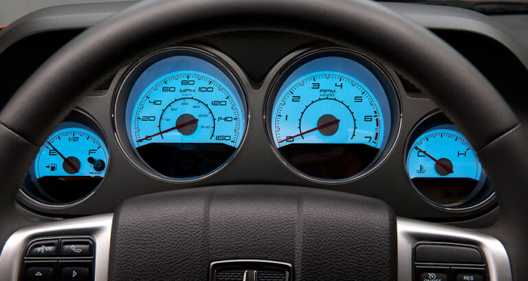 Trapezoidalny panel instrumentów inspirowany wyścigami w Dodge Challengerze teraz posiada nowe wskaźniki w postaci czterech bombowych wskazówek z chromowanymi dekoracyjnymi pierścieniami oraz nową grafiką w stylu sportowym. Wewnątrz wskaźników znajduje się nowy wyświetlacz EVIC z czterema liniami, który jest teraz standardowym wyposażeniem i pokazuje kierowcy informacje o trasie oraz multimedia z radia Media Center.