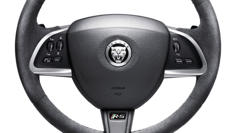 Nowa, skórzana, wielofunkcyjna kierownica została również dodana, oferując piękny, dotykowy interfejs między samochodem a kierowcą, jak i jasne, stalowe pedały z wytłoczonym logo Jaguara.