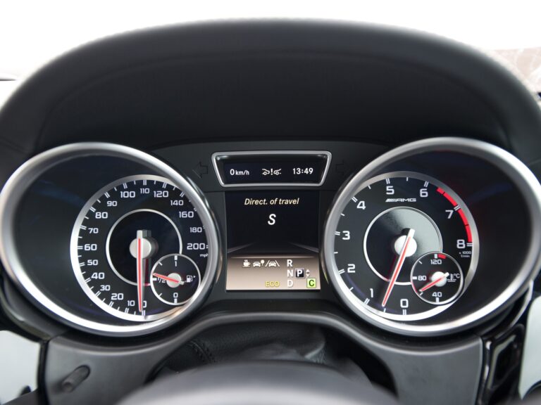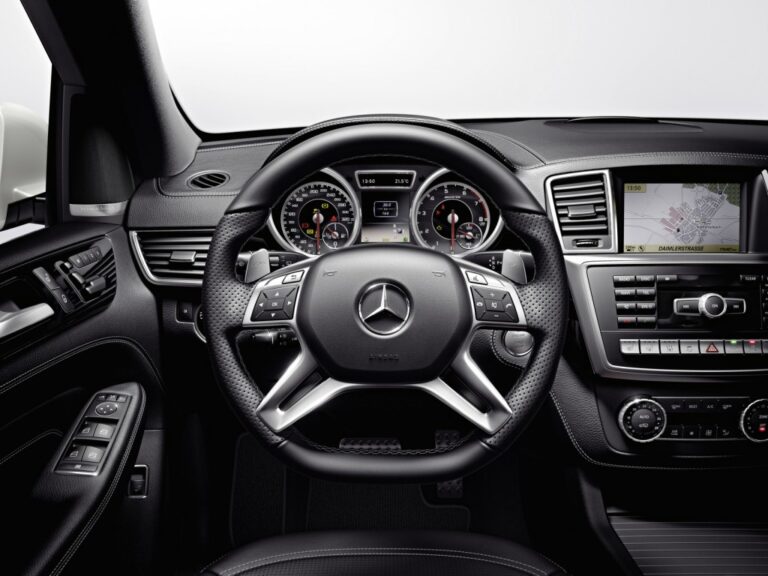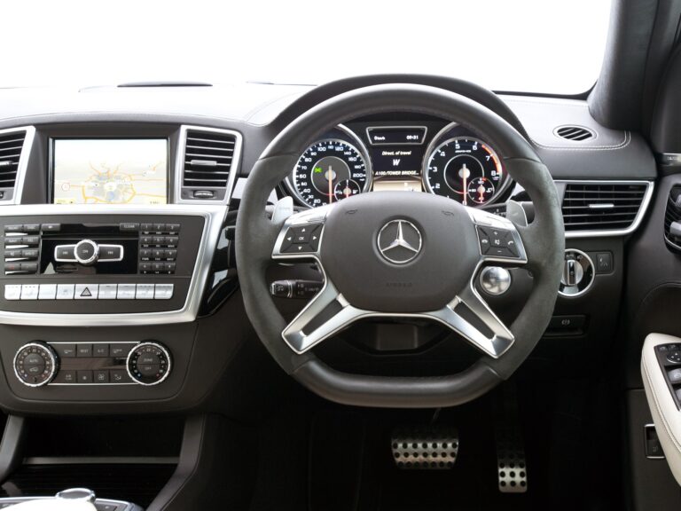 Czteroramienne sportowe koło kierownicy AMG z skórą w strefie uchwytu, aluminiowymi łopatkami zmiany biegów oraz obręczą o spłaszczonym dolnym odcinku umożliwia doskonałą kontrolę nad pojazdem. Jednym z wyjątkowo drobnych i ekskluzywnych detali jest zaprojektowany specjalnie zestaw wskaźników AMG, ponieważ tylko ML63 AMG oferuje kolorowy monitor, który wyświetla atrakcyjne logo powitalne AMG po odblokowaniu pojazdu. Okrągłe wskaźniki mają unikalną grafikę, czerwone wskaźniki, wskazówkę prędkościomierza do 320 km/h oraz charakterystyczne logo AMG.
