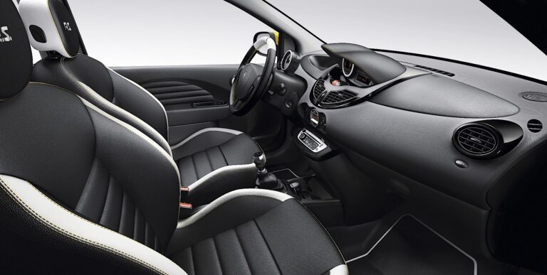 Wewnątrz nastąpiła całkowita metamorfoza. Zamiast nudnych siedzeń i plastiku budżetowego, Twingo R.S. oferował wnętrze o sportowym charakterze. Z przodu producent umieścił zestaw foteli z wysokim oparciem, pokrytych skórą z kontrastowym przeszyciem. Nawet pasy bezpieczeństwa były kolorowe, a nie tylko czarne, jak w pozostałych wersjach. Mimo to, Renault nie mogło umieścić ich niżej, więc pozycja siedzenia pozostała wysoka, co sprzyjało przestrzeni dla pasażerów na tylnej kanapie, którzy mogli wsunąć nogi pod przednie siedzenia.