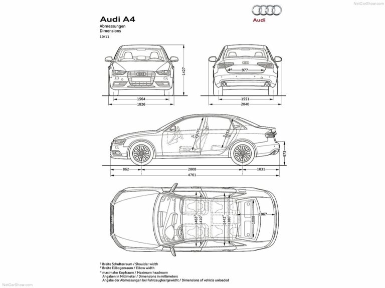 Modyfikacje zmieniły wymiary jedynie o kilka milimetrów. Audi A4 Sedan i Avant mają długość 4,70 metra (15,42 stopy), podczas gdy A4 allroad quattro i S4 mierzą 4,72 metra (15,49 stopy). Rozstaw osi dla wszystkich modeli wynosi 2,81 metra (9,22 stopy), a szerokość to 1,83 i 1,84 metra odpowiednio (6,0 i 6,04 stopy). Wysokość waha się od 1,41 do 1,50 metra (4,63 do 4,92 stopy), w zależności od wersji nadwozia.