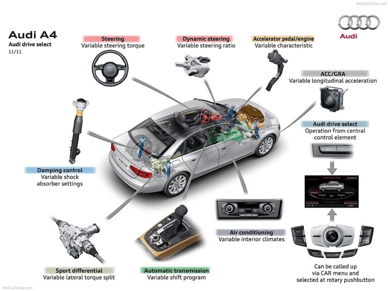 Inną cechą wysokiej jakości, która nadaje Audi A4 szczególny status w swojej klasie, jest Audi drive select. W podstawowym pakiecie kierowca może przełączać charakterystykę przyspieszenia, punkty zmiany biegów automatycznej skrzyni, wspomaganie kierownicy oraz automatyczną klimatyzację między czterema trybami „komfort”, „auto”, „dynamiczny” i „efektywność”. Jeśli pojazd ma system nawigacji, dodatkowy tryb „indywidualny” jest również dostępny.