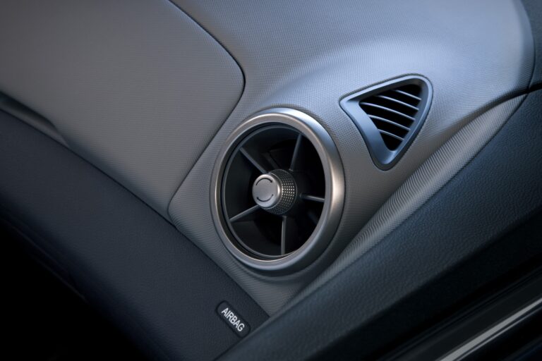 Tubularne otwory wentylacyjne wystają z powierzchni panelu instrumentów.