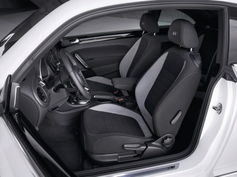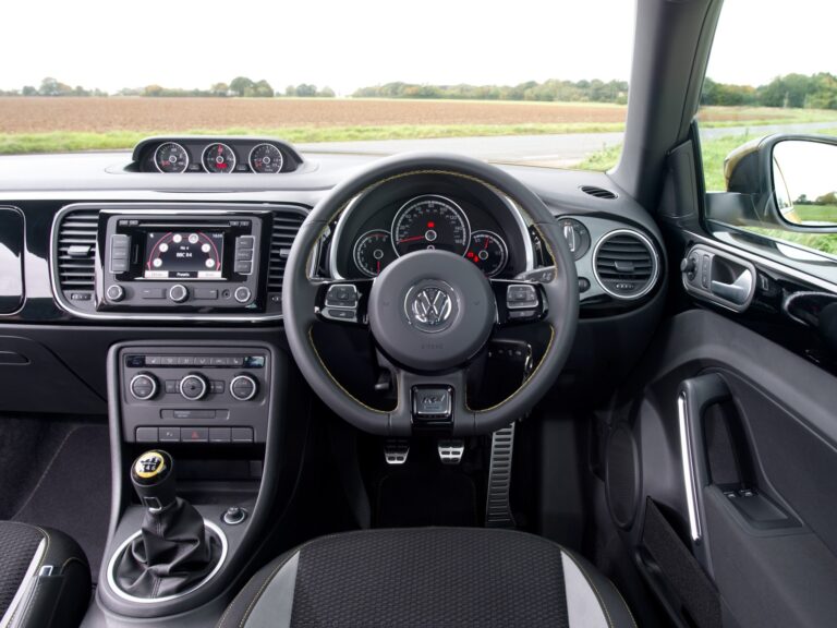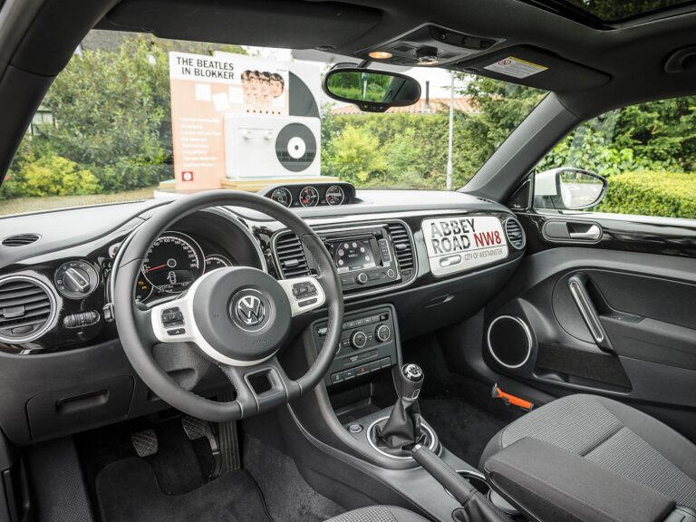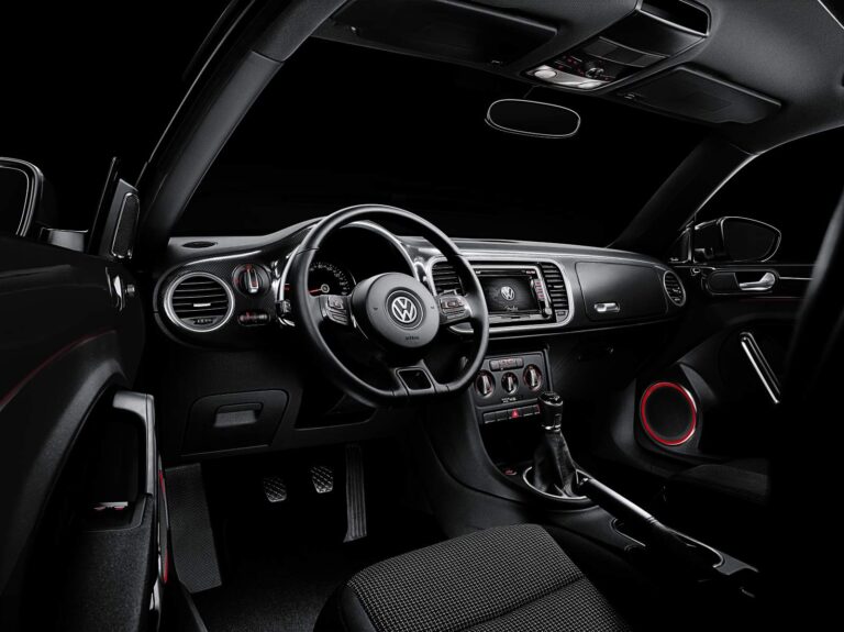 Wszystko w zasięgu wzroku i ręki. Kształt i kolor w malowanej lub węglowej desce rozdzielczej nawiązują do designu pierwszego VW Żuka, jednak nowy samochód nie ma retro wyglądu. W Europie na przykład ta deska jest stylizowana w „Schwarz uni” (Czarna) w modelu podstawowym („Żuk”); w linii wyposażeniowej „Design” jest zawsze malowana w specyficznym kolorze nadwozia. Klienci wybierający poziom „Sport” otrzymują wygląd węglowy („Włókno węglowe”). Niezależnie od używanych kolorów, kierowcy Volkswagena będą mogli z zamkniętymi oczami zlokalizować każdy element wnętrza.