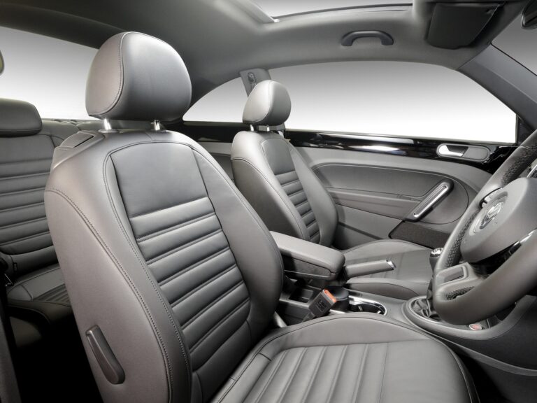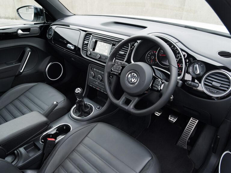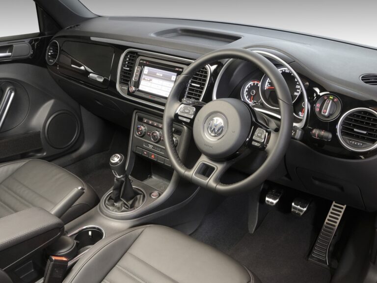 W środku, producent zainstalował deskę rozdzielczą, która była bardziej związana z nowymi samochodami, a jednocześnie nawiązywała do retro tematu pojazdu. Przed kierowcą znajdował się zaokrąglony zestaw wskaźników, w którym prędkościomierz zajmował centralne miejsce i był flankowany przez obrotomierz po lewej, a po prawej stronie znajdował się prawdopodobnie jeden z największych wskaźników poziomu paliwa, jakie kiedykolwiek zainstalowano w samochodzie osobowym. Aby nawiązać do roku wprowadzenia pojazdu, producent oferował jednostkę multimedialną umieszczoną na górze centralnej konsoli, z nawigacją na kolorowym ekranie. Choć nie była to wersja dotykowa, można było się do niej dostać za pomocą przycisków, które ją flankowały. Fotele przednie były wygodne i lekko wyprofilowane, podczas gdy z tyłu Beetle 2011 miał dzieloną kanapę w proporcji 50-50, odpowiednią dla dwóch dorosłych. Niska linia dachu wpływała jednak na przestronność w górnej części dla wyższych pasażerów.