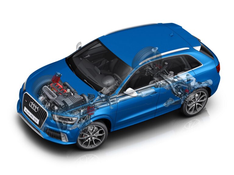 Audi RS Q3 zachwyca dynamicznym i stabilnym prowadzeniem bez utraty komfortu. Sportowe zawieszenie RS obniża nadwozie kompaktowego SUV-a o 25 mm (0,98 cala). Akumulator znajduje się w bagażniku, co pozwala na lepsze rozłożenie ciężaru. Niezależne zawieszenia tylnych kół sterowane są przez cztery wahacze.