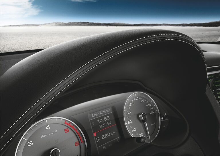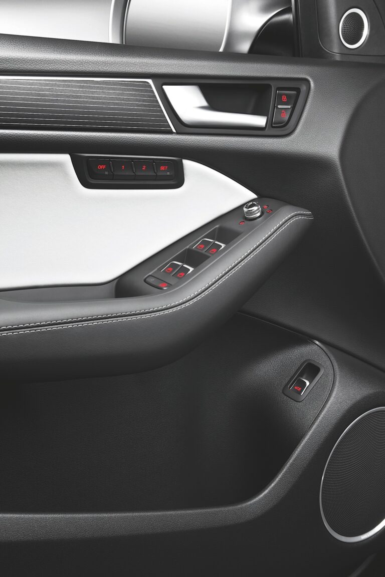 Sportowy charakter przenosi się także na wnętrze. Zegary wyposażone są w szare tarcze i białe cyfry; pedały i łopatki zmiany biegów mają błyszczące wykończenie w stylu aluminium.