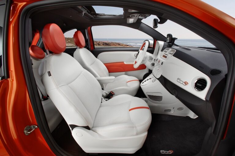 Oprócz prędkości, wyświetlał zużycie energii, zasięg i stan akumulatora. Na centralnej konsoli, zamiast dźwigni zmiany biegów, 500e miało okrągły panel z czterema przyciskami do trybów jazdy. Mimo niewielkich rozmiarów, w pojeździe znalazły się nawet dwa uchwyty na kubki i uchwyt na telefon pomiędzy fotelami na podłodze. Na koniec, producent dumnie umieścił emblemat 500e na desce rozdzielczej przed pasażerem z boku.