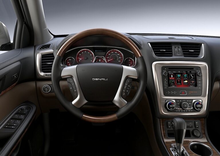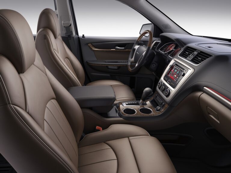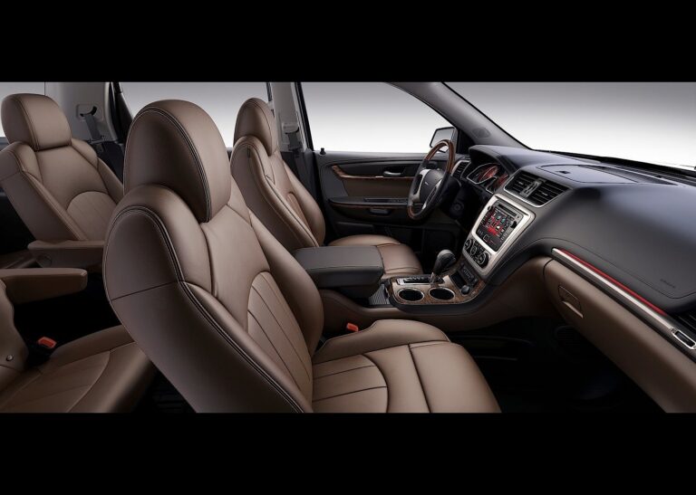 Wnętrze GMC Acadia zostało wzbogacone o lepsze materiały dotykowe, z francuskim przeszyciem, które nadaje elegancki wygląd, oraz z czerwonym podświetleniem płynącym wzdłuż deski rozdzielczej. Modele SLT i Denali mają aluminiowe akcenty na konsoli centralnej, drzwiach oraz desce.
