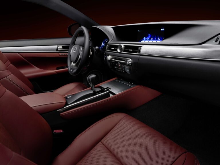 Aby uzupełnić agresywnie wyglądający zewnętrzny design pakietu F Sport, wnętrze będzie miało unikalne wykończenie z gładkimi, prążkowanymi detalami z aluminium, unikalnymi perforowanymi detalami skórzanymi, czarnym podsufitką i aluminiowymi pedałami. Charakterystyczne oznaczenia F Sport będą wyeksponowane na kierownicy. Skupiając się na kierowcy, pakiet F Sport będzie miał nowy fotel sportowy z elektryczną regulacją w 16 kierunkach, zwiększający boczne wsparcie. Fotel kierowcy będzie wyposażony w po raz pierwszy w Lexusa elektryczne boczne podpory, wsparcie ud, regulację oparcia i czterokrotną regulację odcinka lędźwiowego. Aby dopełnić unikalności pakietu F Sport, dostępne będzie także uderzające wnętrze z czerwonej skóry Cabernet.