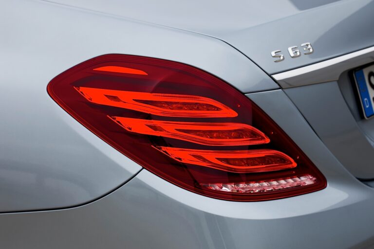 Panele progowe z trójwymiarowymi wkładkami w srebrnym chromie sprawiają, że pojazd wydaje się bliższy drogi i nadają dynamikę bokom z „Linią opadającą”, charakterystyczną dla marki. Duże lekkie felgi to kolejna cecha rozpoznawcza AMG: zapewniają one doskonały widok na wysoko wydajny układ hamulcowy AMG. Napisy „V8 BITURBO” w nowej, współczesnej typografii na przednich błotnikach identyfikują topowy model ośmiocylindrowy. Ta nowa typografia występuje również w oznaczeniu modelu „S63 AMG” na klapie bagażnika. Projekt kończy się potężnym akcentem czarnego wlotu dyfuzora z wykończeniem w srebrnym chromie oraz dwoma chromowanymi, podwójnymi końcówkami wydechowymi sportowego układu wydechowego AMG z klapami.