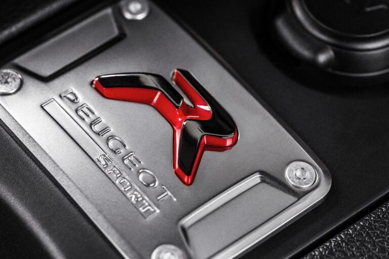 Fotele mają nowy sportowy design, pokryte są mieszanką pełnoziarnistej skóry Nappa i czarnej Alcantary, a ich wykończenie sygnowane jest monogramem 'R’. Na konsoli centralnej znajduje się chromowana płyta, która potwierdza charakter pojazdu z czerwonym wpisanym 'R’, wyłaniającym się z płyty certyfikacyjnej ze szczotkowanego aluminium z czterema widocznymi śrubami mocującymi. Inspirowany lotnictwem, symbolizuje znak 'Peugeot Sport’.
