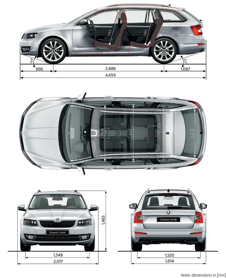 W porównaniu do poprzedniego modelu, prawie 11 cm dłuższy rozstaw osi (2,686 mm w porównaniu z 2,578 mm) podkreśla wyraziste proporcje nowego modelu, podobnie jak krótszy o 886 mm zwis przedni (Octavia II: 915 mm). Całkowita długość nowej Octavii Combi wynosi 4,659 mm, co sprawia, że trzecia generacja jest o 90 mm dłuższa od swojego poprzednika. Długość i szerokość Combi są identyczne jak w limuzynie Octavia. W rzeczywistości, z wysokością wynoszącą 1,465 mm, Combi jest o 4 mm wyższe niż limuzyna.