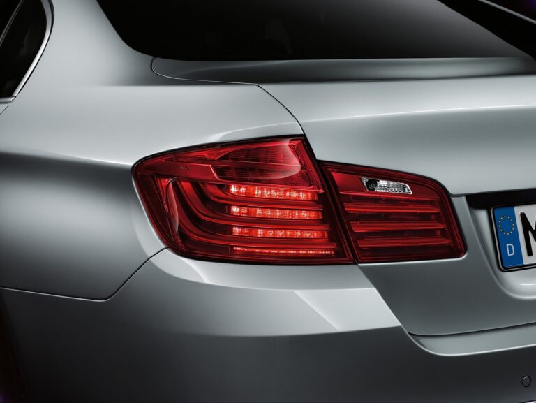 Obok reflektorów LED w opcji oferowane są Adaptacyjne Reflektory LED. Tutaj zarówno światła mijania, jak i drogowe wytwarzane są przez jednostki LED umieszczone na poziomych żebrach w centrum dwóch pierścieni świetlnych, które mają płaską dolną krawędź. Spływające chromowe wstawki z wygrawerowanym logo BMW dopełniają charakterystyczny i niezwykle elegancki wygląd Adaptacyjnych Reflektorów LED. Wskazówki boczne są teraz zintegrowane w zewnętrznych lusterkach we wszystkich nowych modelach BMW serii 5. Sedan i Touring mają nowo zaprojektowane tylne światła z wyjątkowo cienkimi i wyraźnie zarysowanymi paskami świetlnymi LED. Te światła oraz dodatkowy rowek w tylnym zderzaku podkreślają szeroki tor jazdy obu modeli.