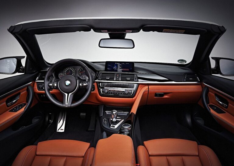 Wnętrze nowego BMW M4 Convertible również nie pozostawia wątpliwości co do jego pokrewieństwa z wysokowydajnymi M3 Sedan i M4 Coupe. Na przykład wiele teraz typowych detali wyposażenia BMW M podkreśla sportowy charakter pojazdu. Należą do nich okrągłe wskaźniki specyficzne dla M z białymi grafikami, skórzana kierownica M z chromowanym wykończeniem i kontrastowym przeszyciem, lewarek zmiany biegów M, wykończenia progów drzwiowych M oraz M pedał do nogi kierowcy.