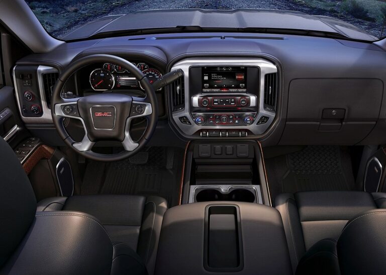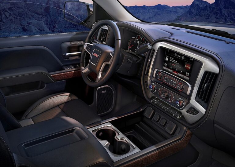 W kabinie dostępne były różne opcje siedzeń, w tym ławka z przodu. Mimo to, większość klientów wolała fotele kubełkowe oraz opcjonalny wysoki środkowy konsol z pomiędzy nimi. Te dwa elementy były standardem w wyższych wersjach i dostępne w innych. Z tyłu, składana ławka rozwiązywała problem przestrzeni do przechowywania w kabinie. Dla kierowcy, GMC zainstalowało szeroki zestaw wskaźników, pełen wszystkich potrzebnych przyrządów i wskaźników dla pickupa. Dodatkowo, środkowy panel wyposażono w nową jednostkę infotainment z ekranem dotykowym, którą można było obsługiwać w rękawicach. Ale GMC skupiło się również na poprawie bezpieczeństwa i w rezultacie, Sierra 2014 miała zaawansowaną kamerę frontalną używaną do systemu ostrzegania o kolizji czołowej oraz ostrzegania o opuszczeniu pasa ruchu, które były dostępne jako opcja.