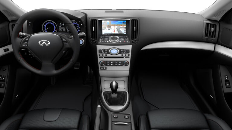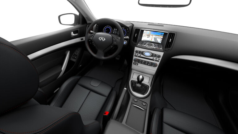 W środku, wysoko wyprofilowane przednie siedzenia były regulowane w 12 kierunkach dla kierowcy i 8 dla pasażera z boku. Oba fotele mogły przesuwać się do przodu jednym przyciskiem, co ułatwiało wsiadanie i wysiadanie osobom siedzącym z tyłu. Pomiędzy przednimi pasażerami producent zainstalował konsolę centralną, w której znajdował się dźwignia zmiany biegów (lub wybierak do automatycznej skrzyni biegów), mała przestrzeń do przechowywania i hamulec ręczny. Na szczycie centralnej konsoli Infiniti umieściło ekran systemu infotainment, który można było obsługiwać za pomocą panelu z fizycznymi przyciskami. Z przodu kierowcy znajdował się mieszany panel instrumentów, zawierający dwie duże tarcze dla prędkościomierza i obrotomierza oraz wyświetlacz LCD między nimi, który pokazywał dodatkowe dane z komputera pokładowego samochodu. Jako opcję klienci mogli zamówić pojazd z szyberdachem.