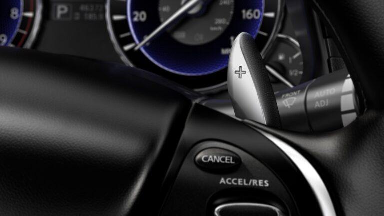 Funkcje technologiczne i wygodności obejmują standardowy INFINITI Intelligent Key z systemem zapłonu przyciskiem, system zdalnego dostępu bezkluczykowego, elektrycznie regulowaną kolumnę kierowniczą z większym zakresem ruchu, podświetloną schowek oraz automatyczną kontrolę temperatury.