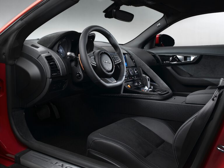 Ekskluzywne wykończenie Jaguara F-Type R Coupé obejmuje także skórę na panelach instrumentów i binnacle, podłokietnikach, wkładkach drzwi i konsoli centralnej. Skórzane lub Suedecloth podsufitki są opcjonalne. Kabina, skoncentrowana na kierowcy, podkreśla sportowe aspiracje za pomocą małej, spłaszczonej u dołu kierownicy pokrytej skórą Jet z logo R. Okrągła kierownica jest opcjonalna bez dodatkowych kosztów.
