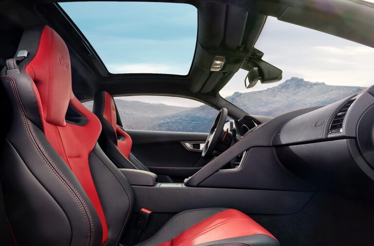 Fotele w Jaguar F-Type R Coupé mają wsparcie boczne z regulacją ciśnienia powietrza oraz wyraźnie zaznaczone skrzydła, które zapewniają wsparcie podczas szybkiego pokonywania zakrętów. Fotele wykończone są skórą premium, z logo 'R’ wytłoczonym na oparciu głowy. Oferowany jest czysty kolor wnętrza 'Jet’ z trzema opcjami kontrastowych przeszyć – Ivory, Red lub Firesand – na panelach instrumentów, obramowaniach drzwi, highlightach uchwytów oraz pudełku na drobiazgi. Dodatkowo są trzy sportowe opcje na fotelach Jet – Ivory, Camel lub Red w podwójnych tonacjach, z podobnie dopasowanym kontrastowym przeszyciem.
