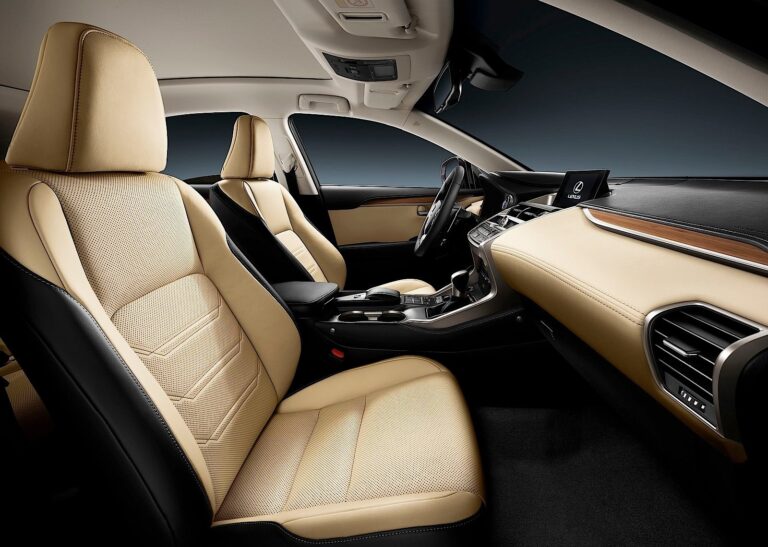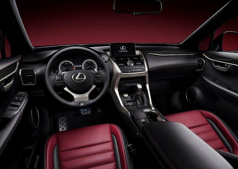 Wewnątrz producent starał się zapewnić wszystko, czego premium klient oczekiwał od pojazdu. W efekcie skórzana tapicerka była w ofercie, ale podstawowa wersja wyposażeniowa miała tapicerkę materiałową, w zależności od rynku. Pomiędzy wysoko umieszczonymi przednimi fotelami, producent zainstalował konsolę centralną, w której umieszczono touchpad do systemu infotainment. Kierowca miał przed sobą zestaw wskaźników wypełniony dwoma dużymi tarczami dla prędkościomierza i obrotomierza, a z boku znajdowały się wskaźniki paliwa i temperatury. Pośrodku Lexus zainstalował mały wyświetlacz kolorowy, który pokazywał dodatkowe informacje dostarczane przez komputer pokładowy. Na wierzchu konsoli centralnej, w swobodnej pozycji, NX miał 6,2-calowy ekran do systemu infotainment. Z tyłu producent zainstalował płaską kanapę na trzy dorosłe osoby, z bardzo małym uwypukleniem na podłodze dla tunelu centralnego.