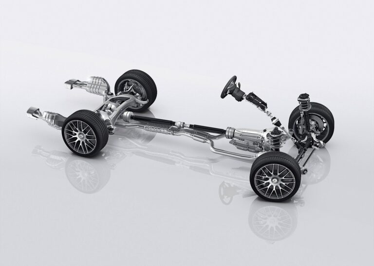Wszystkie modele CLS63 AMG wyposażone są w sportowe zawieszenie AMG RIDE CONTROL z elektronicznie regulowanym systemem amortyzacji, stalowym zawieszeniem z przodu i układem sprężyn powietrznych z tyłu. Charakterystyczne dla AMG cechy, takie jak większy negatywny kąt pochylenia osi i szerszy tor o 24 milimetry z przodu, zapewniają większą stabilność przy dużych prędkościach w zakrętach oraz lepsze odczucie drogi. S-Model i CLS63 AMG z napędem na cztery koła są wyposażone w zoptymalizowane zawieszenie przednie trójramienne, w tym komponenty osi z aluminium. Kierowca korzysta z większej przyczepności i zwrotności oraz wyraźnie neutralnych właściwości jezdnych na szybkich zakrętach. Wyraźnie bardziej ukierunkowane na wydajność elastokinematyki są dostępne wyłącznie w S-Modelu, oferując kierowcy jeszcze lepsze informacje zwrotne i przyczepność na krytycznych granicach.