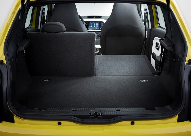 Pojemność bagażnika wynosi 188 litrów, ale oparcia tylnych siedzeń można ustawić w pozycji „cargo” pod kątem 90°, co zwiększa objętość bagażnika do 219 litrów, nadal bezpiecznie przewożąc 2 pasażerów z tyłu. Przy złożonych tylnych siedzeniach w proporcji 50:50, objętość bagażnika zwiększa się do 980 litrów. Wszystkie wersje mają składane siedzenie pasażera z przodu w standardzie – to unikalna oferta w klasie Twingo. Po obniżeniu przedniego siedzenia wnętrze Całkowicie nowego Twingo jest wystarczająco długie, aby pomieścić płaską, szwedzką szafkę lub kontrabas. W kabinie znajduje się również 52 litry osobistej przestrzeni do przechowywania.