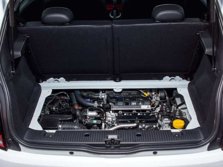 Inżynierowie i projektanci Renault w sprytny sposób pokonali te przeszkody. Silnik jest umieszczony pod kątem 49 stopni, aby nie zajmował miejsca w bagażniku, a w przypadku kolizji tylniej jest popychany pod przestrzeń pasażerską. Pięćdziesiąt procent części silnika zostało zaprojektowanych na nowo, dzięki czemu jednostka napędowa zajmuje o 15 cm mniej miejsca niż przy montażu wertykalnym. Tymczasem Elektroniczna Kontrola Stabilności eliminuje jakiekolwiek możliwość poślizgu na tylnych kołach w śliskich warunkach.