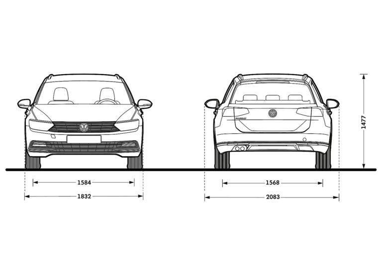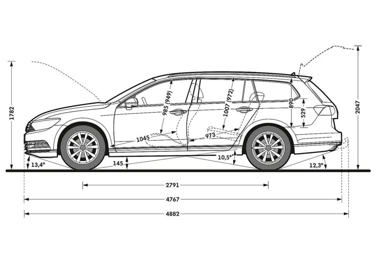 Sedan ma 4 767 mm długości, co oznacza, że jest o 2 mm krótszy od poprzedniego modelu. Jednocześnie jego rozstaw osi został wydłużony o wspomniane 79 mm do 2 791 mm. Przednie koła zostały przesunięte o 29 mm w kierunku przedniego zderzaka, a tylne koła o 17 mm w kierunku tylnego zderzaka (komora pasażerska została wydłużona o 33 mm). Rezultat: krótsze zwisy nadwozia (67 mm mniej z przodu, 13 mm mniej z tyłu). Jednocześnie Passat został obniżony o 14 mm (1 456 mm) i poszerzony o 12 mm (1 832 mm). Te wymiary umożliwiły proporcje, które stworzyły idealne warunki do stworzenia designu, który był równie potężny, co ekskluzywny.