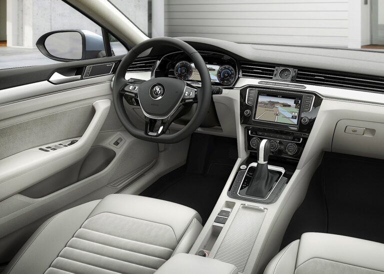 Cel określony na początku opracowywania zaprojektowania poczucia lekkości i przestronności w wnętrzu został zrealizowany przez projektantów z minimalistyczną deską rozdzielczą o konsekwentnej poziomej strukturze, a przednie panele drzwi zostały stylowo wkomponowane w ten design. Centralnym elementem designu deski rozdzielczej jest innowacyjny wlot powietrza, który rozciąga się na całą szerokość wnętrza niczym wstążka i jest zaprojektowany jako funkcjonalny element dekoracyjny. Dzięki temu w nowym Passacie nie ma oddzielnie umieszczonych dysz powietrznych, tylko jeden ciągły element, który jest przerywany jedynie przez instrumenty i analogowy zegar w środku deski rozdzielczej – konsekwentnie łączy formę i funkcję. Wyraźny charakter architektoniczny tworzy imponująca długość chromowanych finów wbudowanych w wloty powietrza oraz zintegrowana dekoracyjna płyta poniżej. Wymiary wlotu powietrza wpływają nie tylko na design deski rozdzielczej; mają również pozytywny wpływ na wydajność klimatyzacji i akustykę wentylacji.