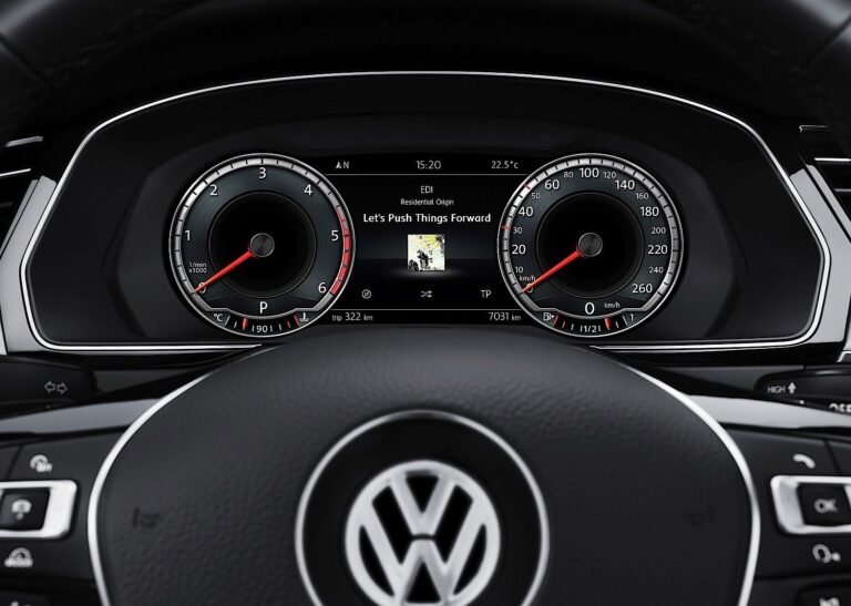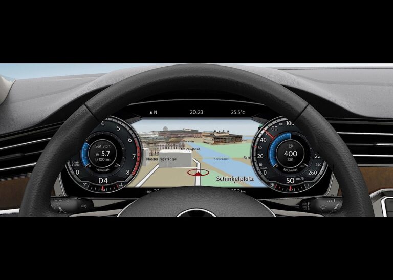 W Passacie Volkswagen wprowadza zestaw wskaźników zaprojektowany jako w pełni interaktywny wyświetlacz: Active Info Display. Wszystkie wskaźniki są realizowane wirtualnie za pomocą oprogramowania. Tylko ikony świetlne w dolnej części wyświetlacza są nadal realizowane w formie sprzętowej. Informacje nawigacyjne mogą być wyświetlane w widokach 2D lub 3D na 12,3-calowym wyświetlaczu. Jego rozdzielczość 1 440 x 540 pikseli pozwala na ekstremalnie precyzyjną, wysokiej jakości grafikę i interaktywną prezentację wszystkich detali. Weźmy na przykład tryb nawigacji: tutaj prędkościomierz i obrotomierz zostają przeniesione na boki, aby stworzyć więcej przestrzeni dla mapy. Informacje o jeździe, nawigacji i pomocą mogą być integrowane w graficznych obszarach prędkościomierza i obrotomierza w zależności od potrzeb. Dane wyświetlane na konsoli centralnej za pomocą systemu multimedialnego, takie jak strony kontaktów telefonicznych czy okładki CD, mogą być także wyświetlane w Active Info Display w Passacie. Volkswagen oferuje Active Info Display jako opcjonale rozwiązanie alternatywne dla analogowych wskaźników.
