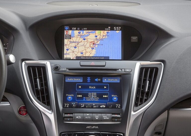 Wszystkie modele TLX posiadają jasny, pełnokolorowy 8-calowy ekran audio/informacyjny umieszczony wysoko w centralnej konsoli panelu instrumentów. Jego wysokie umiejscowienie sprawia, że znajduje się blisko linii wzroku kierowcy, co ułatwia jego obserwację. Oprócz informacji o systemie audio, ekran oferuje również widok kamery tylnej podczas jazdy wstecz i dostęp do różnorodnych konfigurowalnych funkcji.