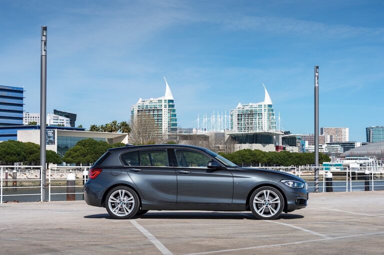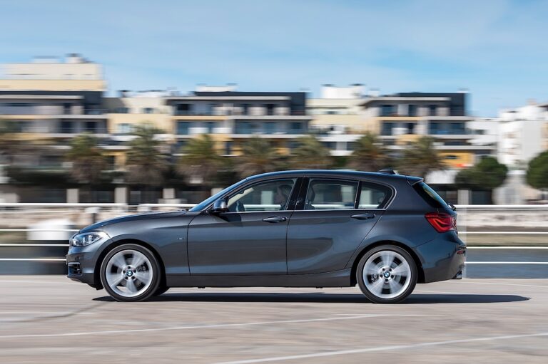 Z profilu zmiany były mniej widoczne, ale jednak obecne. BMW podkreśliło wznoszącą się linię przetłoczeń, która przebiegała przez samochód od przednich błotników do tylnych świateł. Nawet w pięciodrzwiowej wersji, samochód wciąż wyglądał sportowo, zwłaszcza gdy był wyposażony w opcjonalne pięcioramienne felgi oferowane przez dział motorsportu producenta, słynną markę M. Klienci mogli zamówić pięciodrzwiową Serię 1 z 2015 roku z felgami aluminiowymi o średnicy do 18 cali, w zależności od wersji, podczas gdy modele podstawowe miały zestawy 16-calowe. Z tyłu, przeprojektowane tylne światła LED były wydłużone od błotników do nowego tylnego drzwi. Ich L-kształtne paski i pozioma forma sprawiały, że pojazd wyglądał na szerszy.