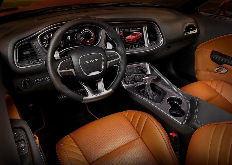 Wnętrze zaskakiwało nowym designem. Przed kierowcą znajdował się nowy zestaw wskaźników, który pokazywał siedmiocalowy konfigurowalny wyświetlacz dla kierowcy (DID), flankowany retro-stylizowanymi prędkościomierzem i obrotomierzem. Kierowca miał do dyspozycji ogrzewany, płaski koło kierownicy z logo SRT na środku. W tym samym czasie poziome ramiona koła kierownicy miały przyciski do obsługi systemu multimedialnego, tempomatu i innych funkcji DID. Przednie fotele miały wysokie oparcia pokryte skórą, zapewniając doskonałe wsparcie boczne podczas szybkiego pokonywania zakrętów, a konsola centralna między nimi różniła się w zależności od wersji samochodu. Obie miały ten sam trapezoidalny kształt, ale Challenger SRT 392 charakteryzował się wzornictwem „Hectic Mesh”, podczas gdy SRT Hellcat miał wykończenie „Dark Engine Turn”.