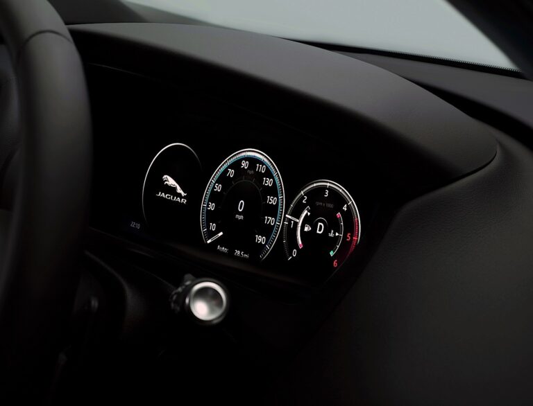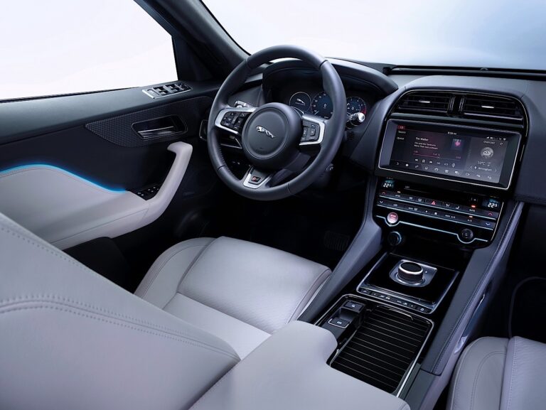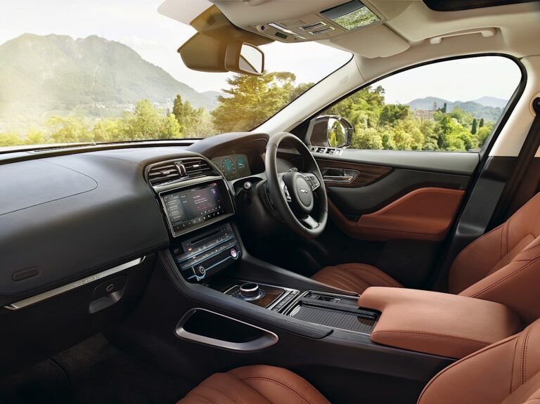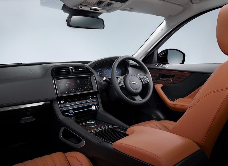 Wnętrze wykonane jest z miękkiej skóry Windsor w kolorze Light Oyster, z podwójnymi szwami i tłoczonym wzorem houndstooth, inspirowanym nagradzanym wnętrzem C-X17. Tradycyjny rzemiosło Jaguara płynnie łączy się z konfigurowalnym 10-kolorowym oświetleniem ambientowym, nowoczesnym systemem multimedialnym InControl Touch Pro oraz 12.3-calowym wirtualnym kokpitem HD.