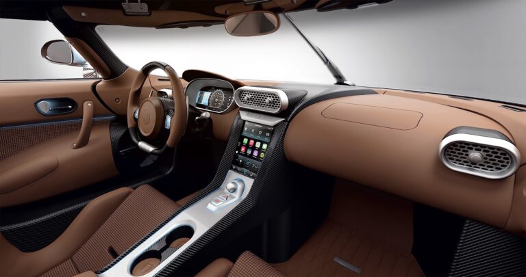 Wnętrze oferuje dodatkową izolację, 8-kierunkowo elektrycznie regulowane fotele z pamięcią. System informacyjno-rozrywkowy Koenigsegg 9″, łączność 3G i Wi-Fi, system kamer z przodu, wewnątrz i z tyłu z możliwością nagrywania, Apple CarPlay, doskonały system audio, oświetlenie ambientowe i wiele innych wspaniałych nowych funkcji. Regera ma również czujniki parkowania z przodu i z tyłu oraz zdalną diagnostykę i możliwość aktualizacji oprogramowania.
