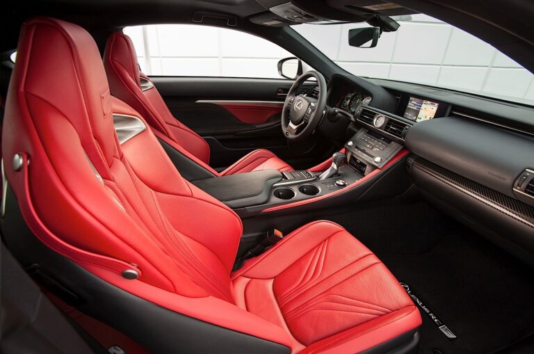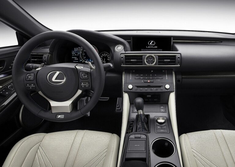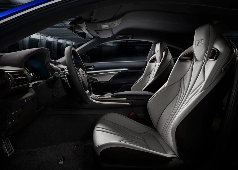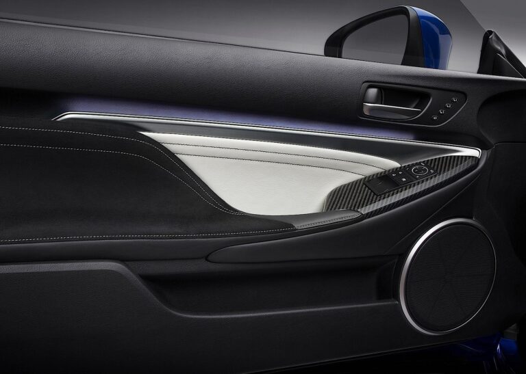 Inspiracją dla projektu kabiny ponownie był super samochód LFA. Unikalne komponenty dla RC F obejmują wskaźniki, kierownicę, fotele, wykończenie i pedały. Wszystkie są zaprojektowane tak, aby dać kierowcy jak najbliższe połączenie z drogą, ale wciąż zapewniając codzienny komfort. Nie ma również oszczędności na luksusie. RC F, na przykład, dzieli nowy pakiet ambientnego oświetlenia wewnętrznego z linią RC. Światło odbijające się od diod LED w panelach drzwiowych tworzy poczucie gościnności podobne do tego, które używa się wzdłuż ścieżek domów.