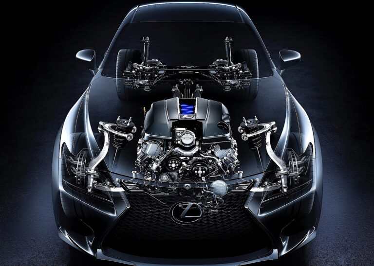 RC F dodaje do platformy ekskluzywne elementy, w tym wzmocnienie komory silnika łączące wieże zawieszenia z przodu oraz znaczny wzmocniony element w kształcie litery V z tyłu. Wzmocnienie czołowe łączy sekcję przedniego słupka i panel przedni, zwiększając reakcję kierownicy i odczucia przechyłów. Montaż tylnego zawieszenia został wzmocniony, aby zapewnić maksymalną przyczepność.