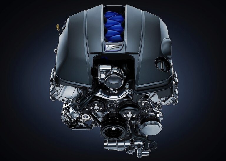 Czerpiąc inspirację z dźwięku i uczucia natychmiastowego momentu obrotowego silnika LFA V10, inżynierowie zasadniczo zachowali blok cylindrów i wymienili większość innych części. Dzięki całkowicie nowym głowicom cylindrów, wyższemu ciśnieniu sprężania i lżejszym elementom wewnętrznym moc wzrosła o 51 koni mechanicznych do 467 koni, a silnik może teraz osiągać obroty do 7100 rpm w porównaniu do 6800 rpm w IS F. Stosunek sprężania został zwiększony do 12,3:1 (z 11,8:1), co zwiększa moment obrotowy w całym zakresie prędkości silnika. Udoskonalone systemy chłodzenia silnika i skrzyni biegów radzą sobie z prowadzeniem na torze.