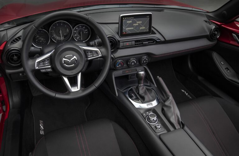 Na pierwszy rzut oka kabina wydawała się ciasna i niewygodna. Jednak wcale tak nie było, przynajmniej dla osób poniżej 6,2 stopy (1,85 m) wzrostu. Wzmocnione fotele były oddzielone wysokim środkowym konsolą, w której znajdowały się przyciski do systemu multimedialnego, chociaż Mazda zamontowała ekran dotykowy dla jednostki infotainment. Ponieważ kabina miała minimalistyczny charakter, nie miała nawet schowka. Mimo to, w centralnej konsoli znajdowały się pewne przestrzenie do przechowywania.