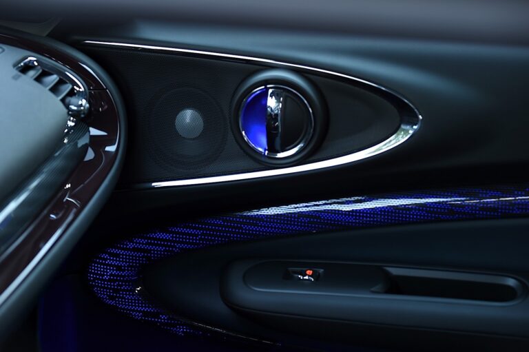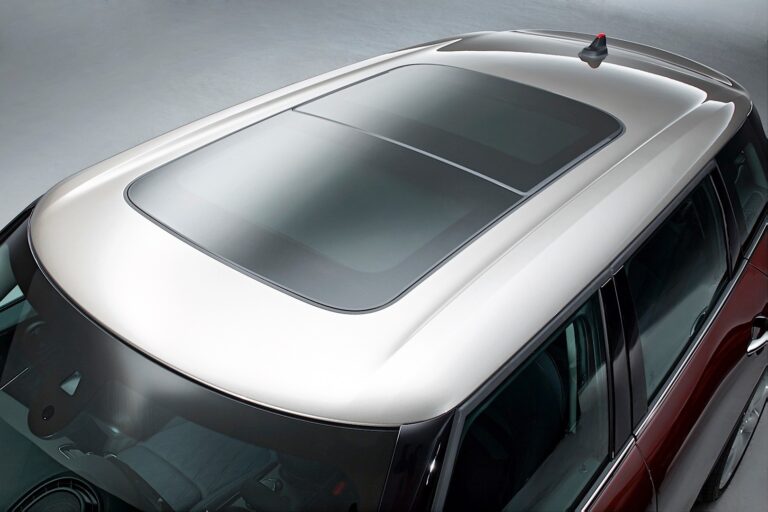 Clubman oferuje opcje personalizacji, takie jak elektrycznie regulowane fotele, szeroki wybór tapicerki oraz powierzchni wnętrza, a także panoramiczny dach o długości niemal 50 cali, co potęguje poczucie przestronności.